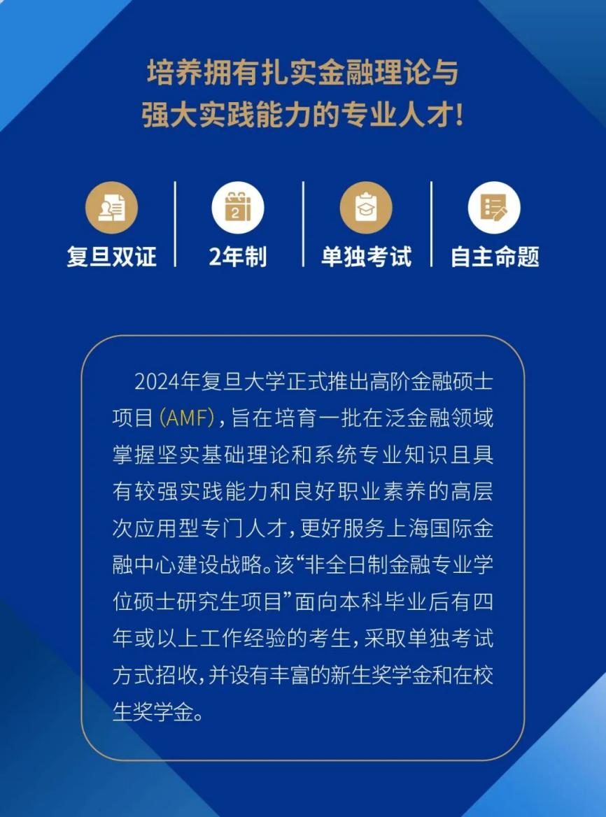 In 2024, Fudan University officially launched the Advanced Master of Finance, aiming to cultivate a group of high-level application-oriented professional talents who have grasped solid fundamental theories and systematic expertise in pan-finance areas while also possessing strong practical abilities and good professionalism to better serve the strategic construction of Shanghai International Financial Center. The “part-time master’s of finance program” is for graduates with four years or more of work experience and enrolls by separate examinations. It has set abundant scholarships for freshmen and current students.